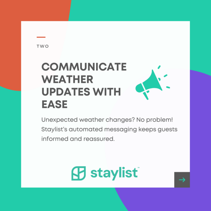 From unexpected winter storms to rainy summer afternoons, weather can quickly change plans. Staylist’s automated messaging tools help you notify guests about closures, alternative arrangements, or updates in real-time, ensuring they’re informed and at ease.
