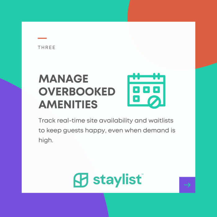 During peak seasons, demand for amenities like hookups, laundry facilities, or activity spaces can skyrocket. Staylist’s real-time availability tracking and automated waitlist features help you manage expectations and keep guests happy.