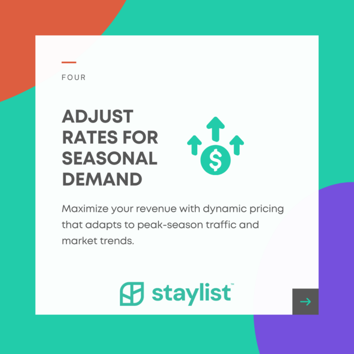 Whether you’re a winter retreat for snowbirds or a summer getaway hotspot, Staylist’s dynamic pricing feature adjusts rates based on availability and market trends. Maximize revenue while staying competitive and fair for your guests.