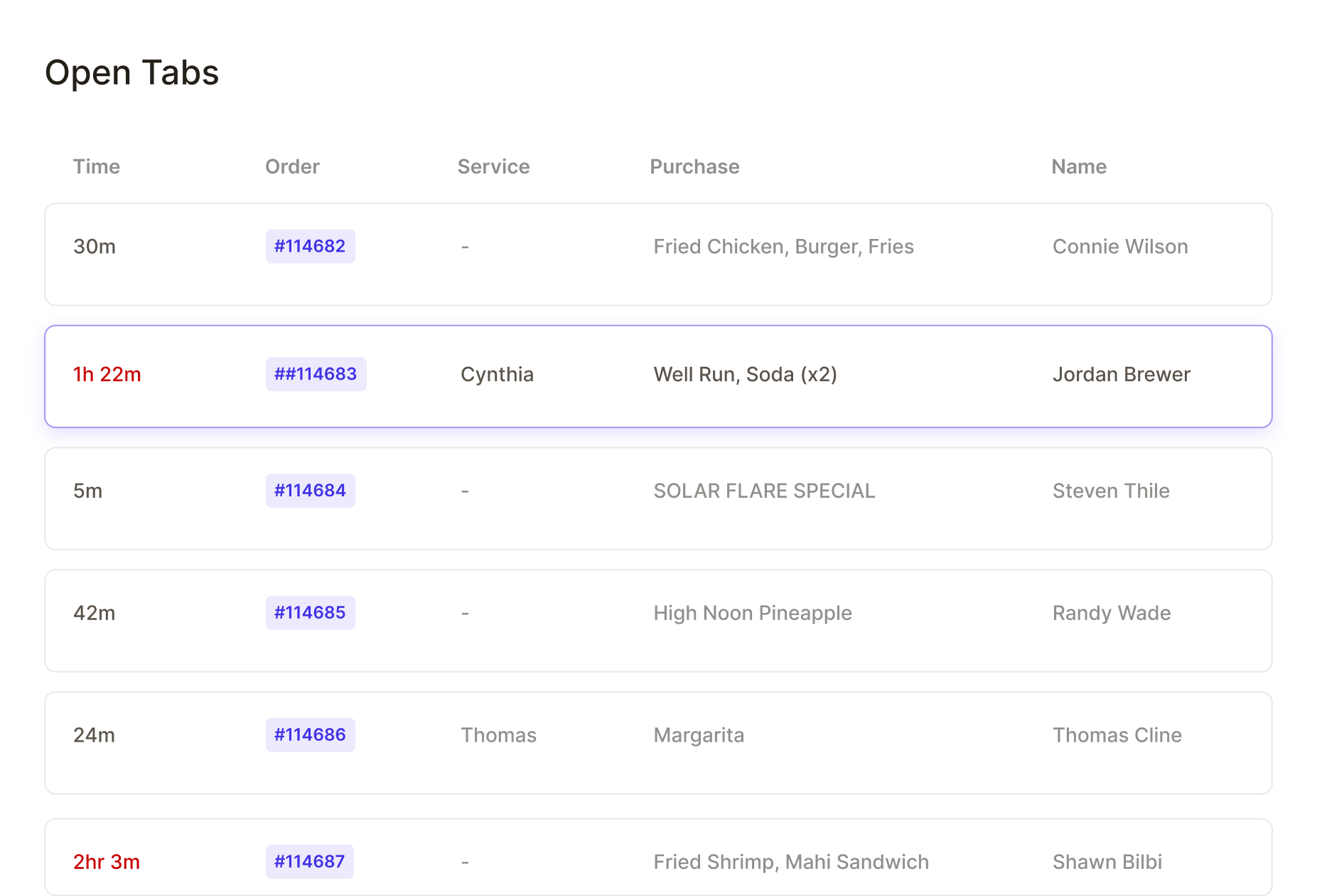 Open multi-day tabs, split checks, add rounds, and close to folio or card.